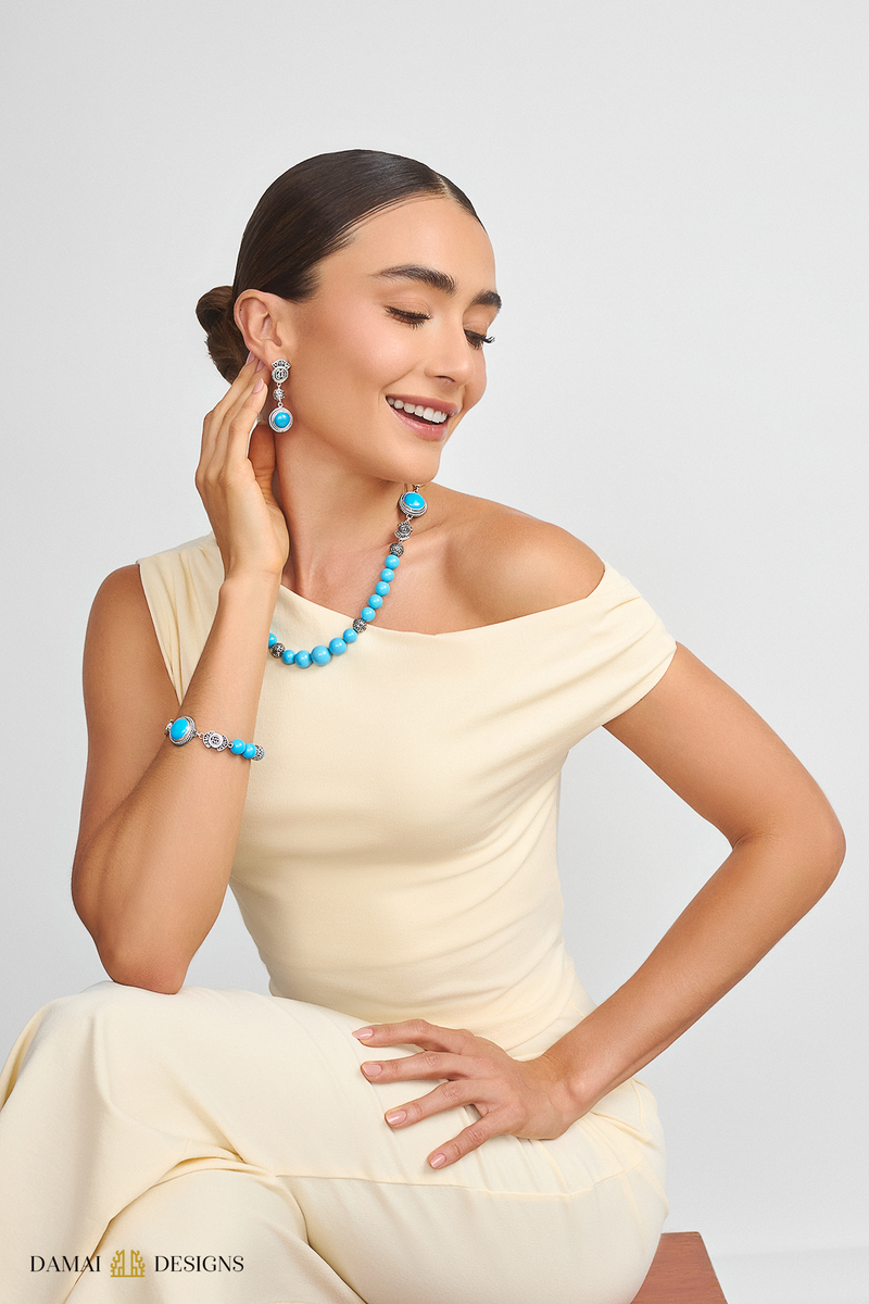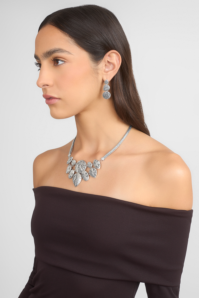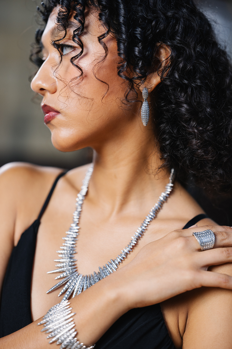 Silver forms that sway with light and motion, framing the face in quiet rhythm and refined expression.